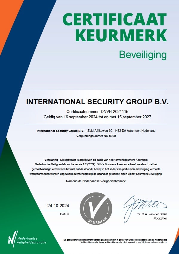 ISG Security is officially recognized by the Dutch Ministry of Justice and Security and registered under license number ND-6000.